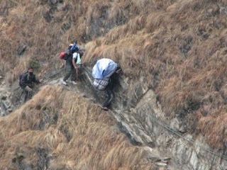 Et pour le passage “via ferrata” dangereux (vieilles corde(lettes)) et pitons en bois cela est objectivement risqué surtout avec 25 a 50Kg sur le dos.