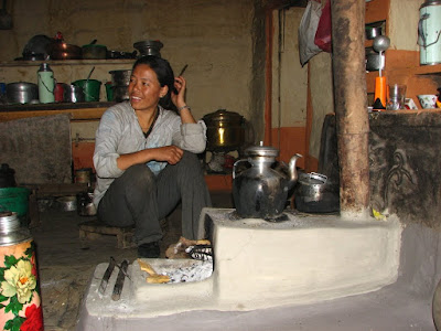 Le réchaud à gaz amené par Dhoma n’est pas dans la cuisine. Il est dans un lodge, à Ranipowa, où elle et ses parents devaient séjourner dans la suite afin de surveiller les travaux de construction. Mais il n’y a personne (pour l’instant) au village pour s’occuper des vaches. ==> cuisine au feu ouvert dans la sombre pièce cuisine et fumée garantie pour les jours à venir. Compter 2h le matin et 2-3h le soir dans cet environnement enfumé. On se découvre rapidement des similarités avec le jambon (fumé).